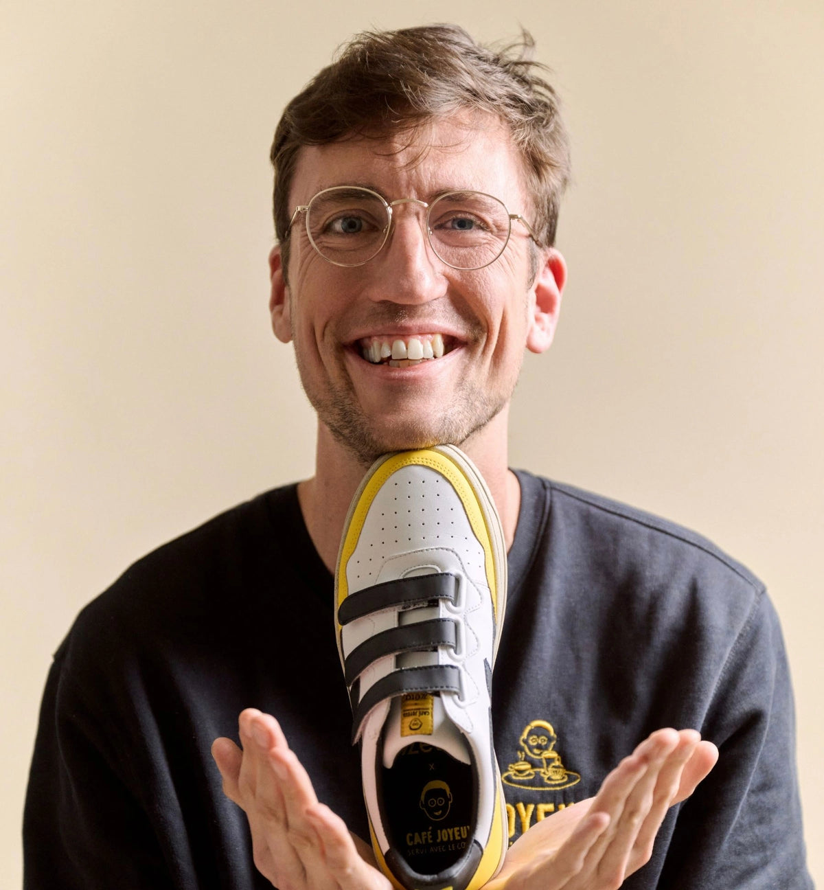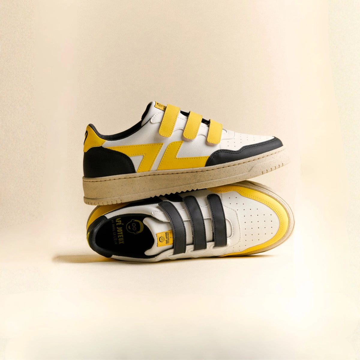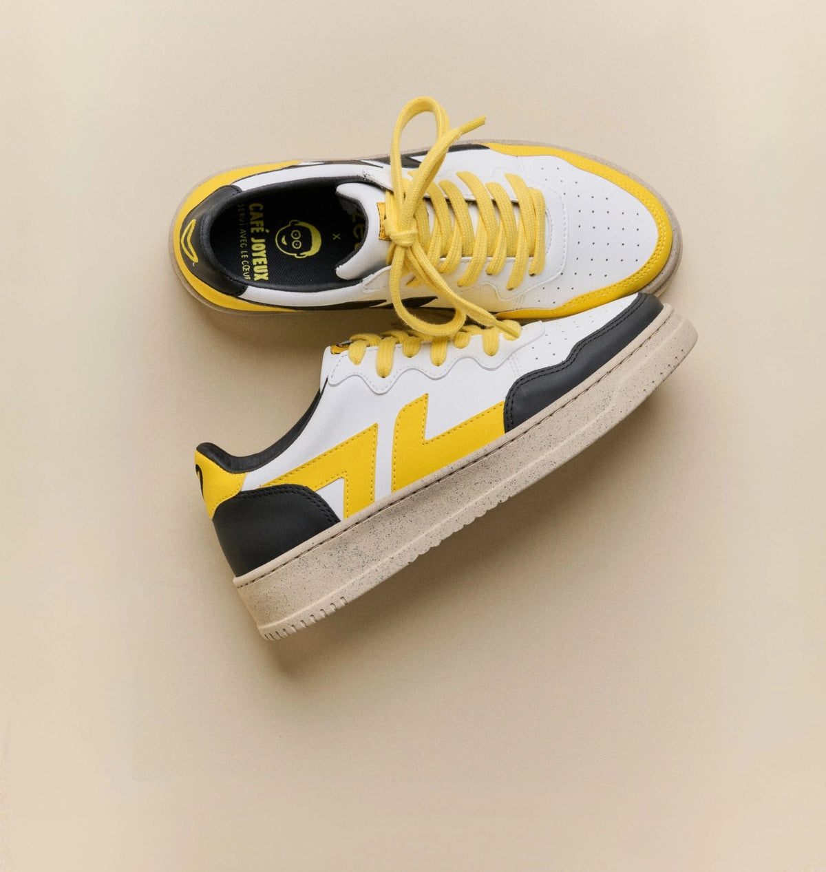 L'asymétrie assumée : Une paire dépareillée aux couleurs emblématiques de Café Joyeux.