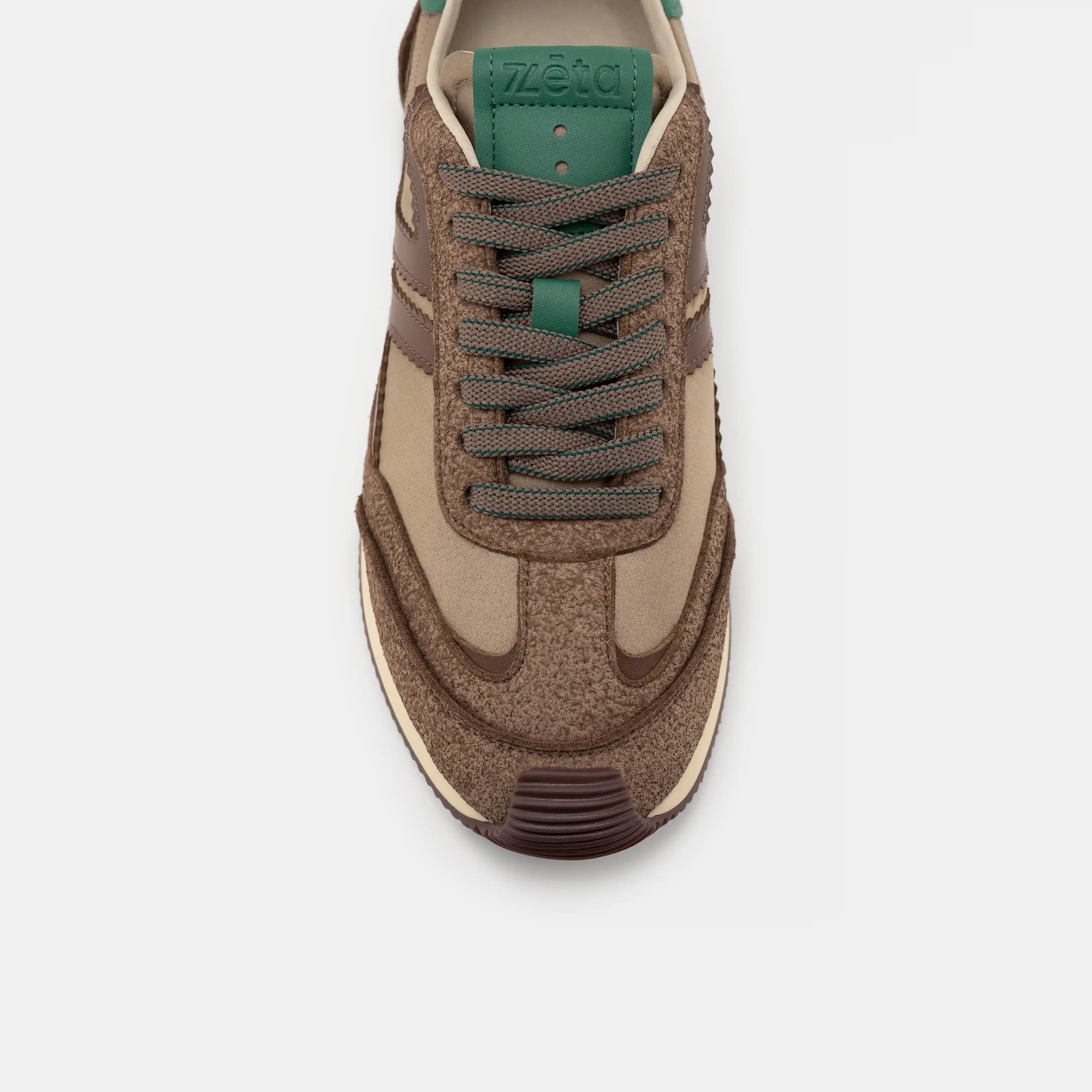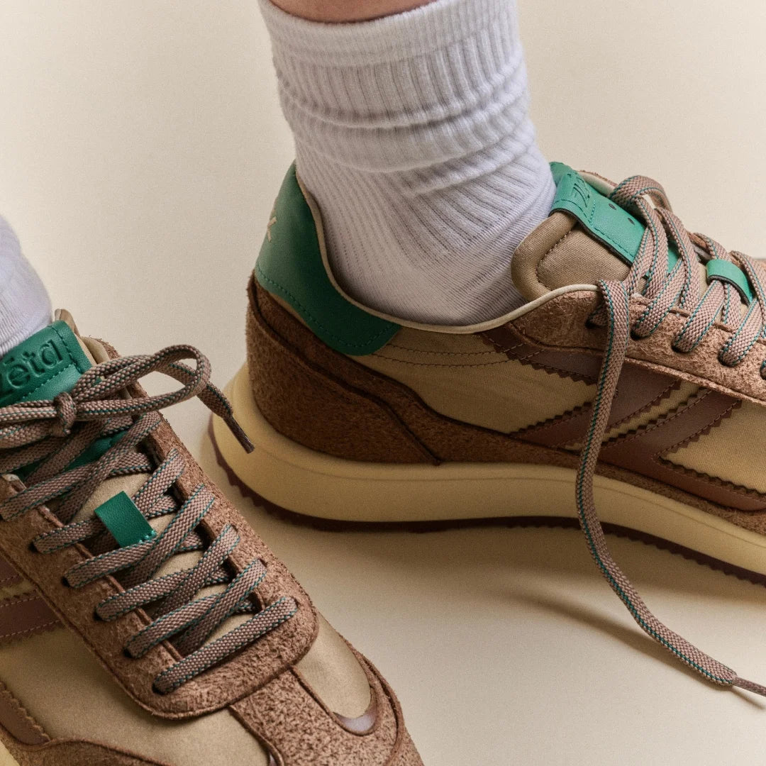Clin d'œil aux années 70, l’Omega réinvente l’esprit running avec modernité. Un jeu de textures audacieux, des empiècements colorés et une semelle crantée qui amortit chaque pas. Un saut dans le temps, avec une longueur d'avance.