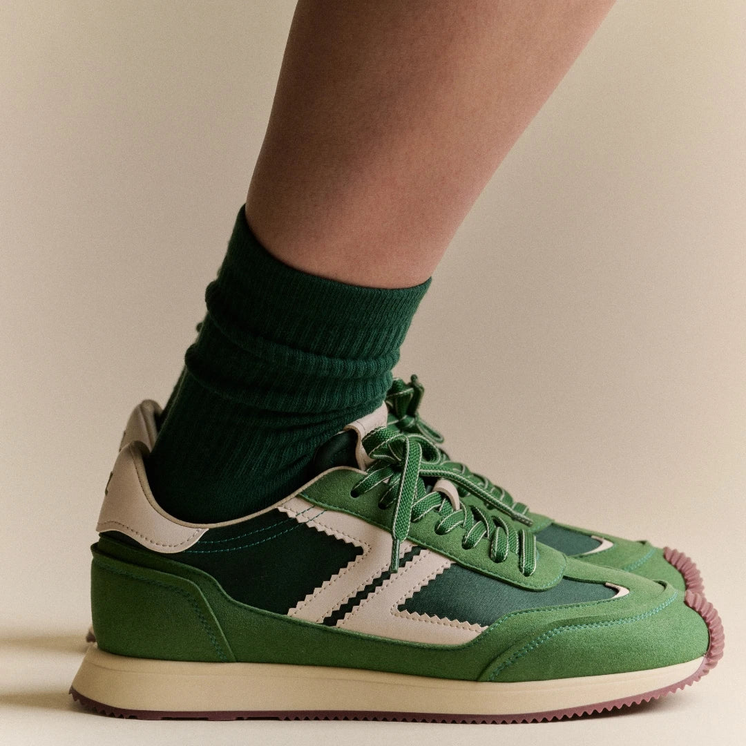 Clin d'œil aux années 70, l’Omega réinvente l’esprit running avec modernité. Un jeu de textures audacieux, des empiècements colorés et une semelle crantée qui amortit chaque pas. Un saut dans le temps, avec une longueur d'avance.
